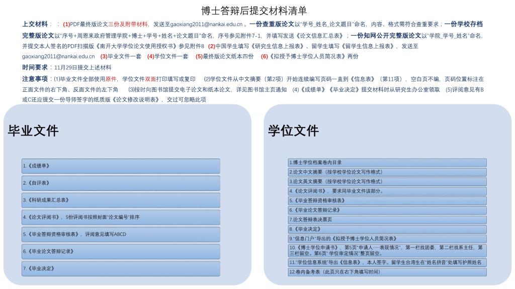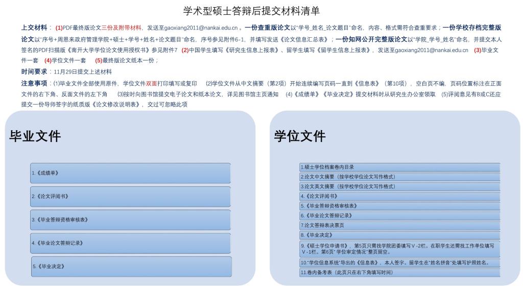 学术型硕士、博士答辩结束后需要及时准备各种毕业及申请学位的材料,需要提交的材料清单如下: