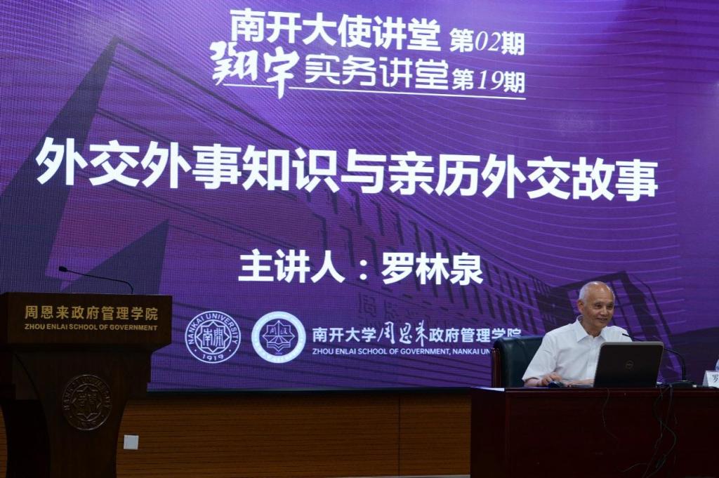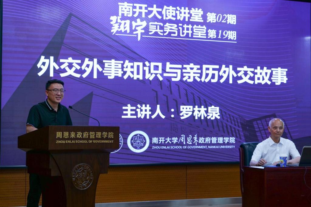 2025年6月5日,太阳成集团tyc234cc“南开大使讲堂”第2期暨翔宇“实务讲堂”第19期在政府管理公司128报告厅举行。本期讲座特别邀请了外交部礼宾司原司长、前中国驻纽约总领事馆副领事、前外交部驻香港特别行政区特派员公署参赞、前中国驻希腊共和国特命全权大使、前中国驻爱尔兰特命全权大使、前中国驻旧金山总领事(大使衔)罗林泉大使,以《外交外事知识与亲历外交故事》为主题,为现场师生带来了一场精彩的讲座。政府公司党委书记王慧、副经理张发林教授、刘兴华教授、王耀辉博士和李圣达博士等出席。本次讲座由张发林教授主持,近百名南开师生参加,现场气氛热烈。