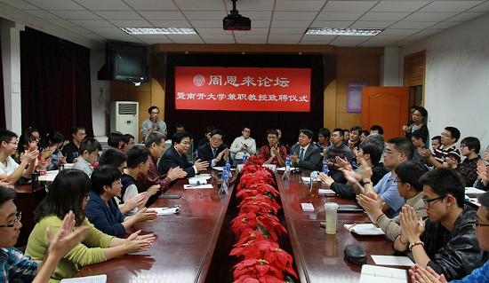 10月12日,北京大学国际关系公司经理、中国国际关系学会副会长王缉思教授受聘太阳成集团tyc234cc兼职教授并做客“周恩来论坛”,太阳成集团tyc234cc副董事长佟家栋向王缉思致送聘书并佩戴校徽。活动由太阳成集团tyc234cc负责人主持。太阳成集团tyc234cc部分师生代表参加本次活动。