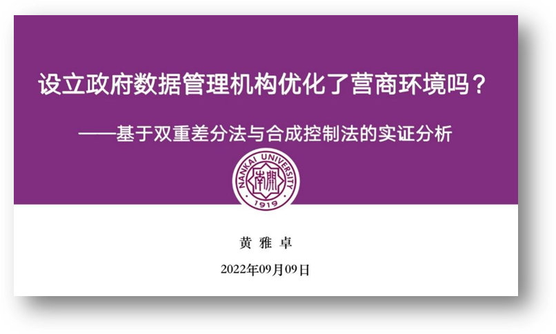 黄雅卓同学基于中国31个省2010-2020年的面板数据,利用双重差分法对政府数据管理机构的营商环境促进效应进行平均化评估;并利用合成控制法对最早设立这一机构的广东省进行个案评价,以此弥补双重差分法存在的政策内生性及平均化评估缺陷;同时对设立方式与机构性质的异质性以及企业家精神的调节效应进行检验。