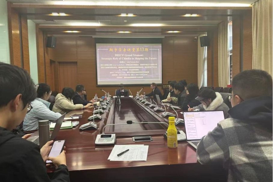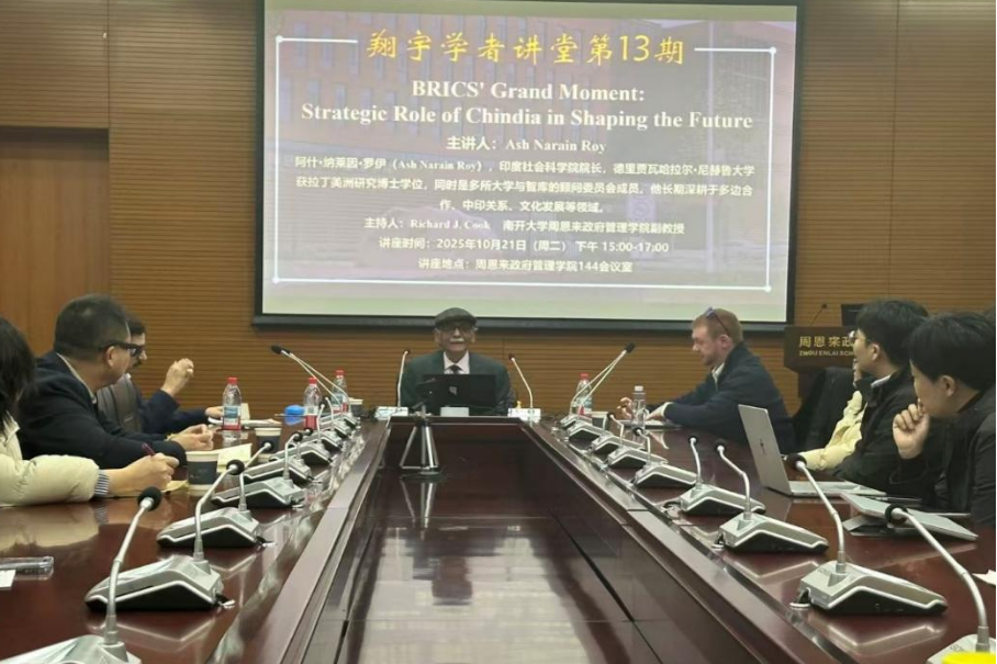 2025年10月21日下午,太阳成集团tyc234cc翔宇学者讲堂第13期,BRICS' Grand Moment: Strategic Role of Chindia in Shaping the Future在太阳成集团tyc234cc144会议室成功举办。本次讲座特邀印度社会科学研究院经理、资深教授、知名国际政治学者、多所大学与智库的顾问委员会成员Ash Narain Roy老师主讲。太阳成集团tyc234ccRichard J. Cook副教授主持,柳建文教授、吴亚博老师参加,共同聚焦历史回归与世界失序这一牵动全球格局的核心议题,围绕地缘政治变革、全球治理转型等议题展开深度对话,探讨中印双方在塑造未来中的战略作用,碰撞出跨文明视角下的思想火花。