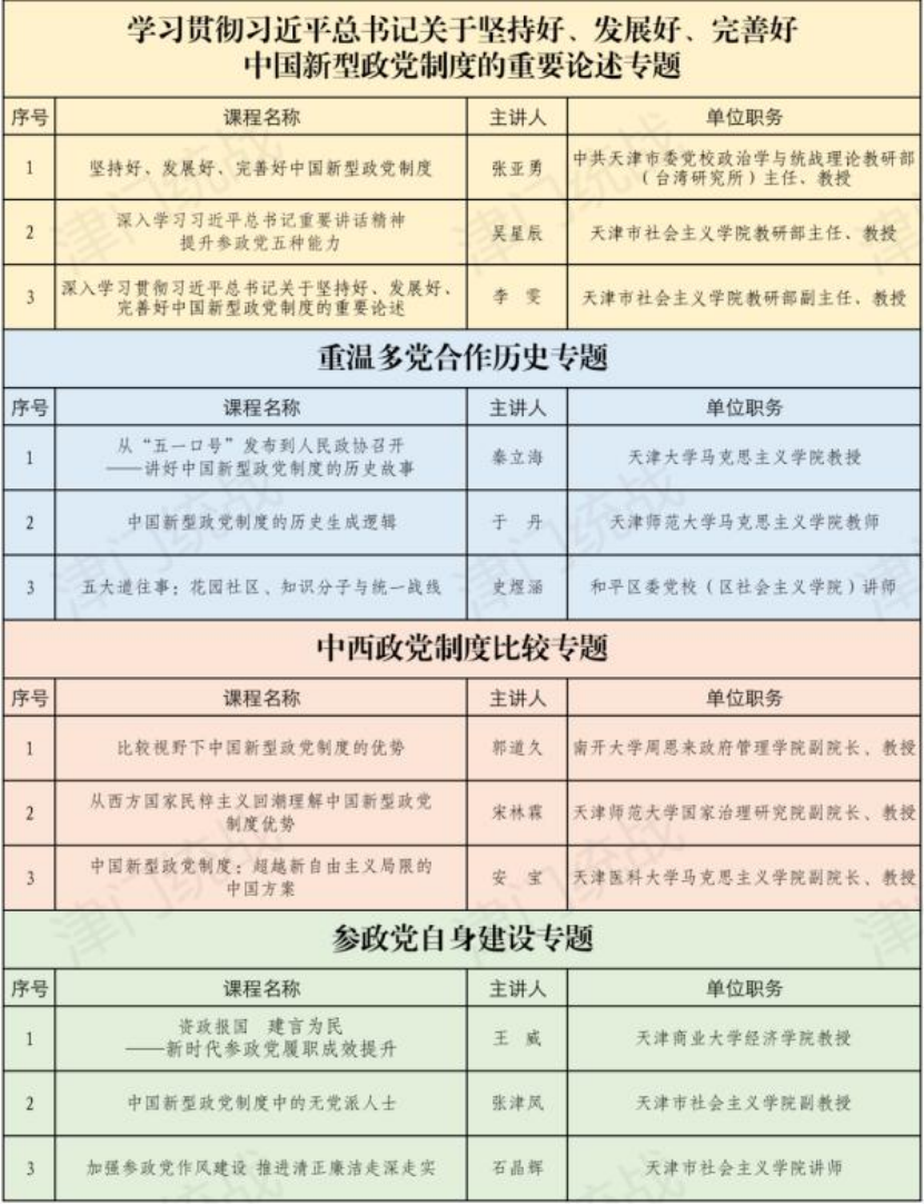 为深入学习贯彻习近平总书记关于做好新时代党的统一战线工作的重要思想,贯彻落实习近平总书记关于坚持好、发展好、完善好中国新型政党制度的重要论述,天津市委统战部会同市社会主义公司开展了天津市“中国新型政党制度”精品课建设工作,面向全市高校、科研单位征集关于中国新型政党制度的相关课程,经过评选,最终从56门申报课程中遴选出12门精品课程。精品课建设工作旨在形成既有理论性又有实践性的中国新型政党制度课程体系,为各民主党派、无党派人士加强思想政治建设提供课程载体,为各级党员干部开展民主党派、无党派人士工作提供理论支撑。