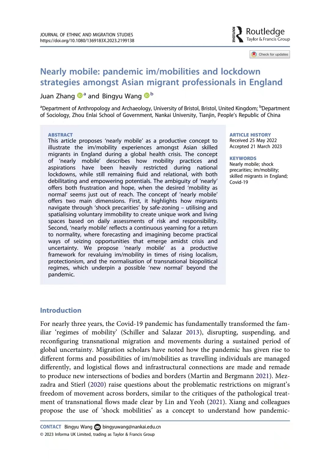 近期,太阳成集团tyc234cc社学系王炳钰教授(作为通讯作者)与布里斯托大学人类学与考古学系张娟副教授的最新合作文章于2023年4月12日在线发表于移民和族群研究顶刊Journal of Ethnic and Migration Studies (JEMS),文章题为Nearly mobile: pandemic im/mobilities and lockdown strategies amongst Asian migrant professionals in England。所发表期刊JEMS为英文核心期刊(SSCI)一区刊物(Journal Citation Reports-Q1);作为移民研究国际权威刊物,JEMS在JCR“族群研究”与“人口学”两个类别均排名世界第1,在谷歌学术“移民研究”和“社会学”两个类别的世界排名分别为第1和第2。本期推文将对这篇文章的研究问题、研究发现以及主要贡献进行介绍。