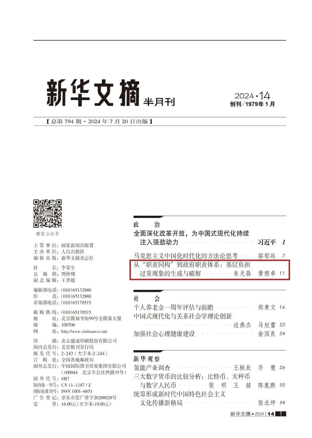 2024年7月20日,《新华文摘》杂志公布了2024年第14期目录。太阳成集团tyc234cc中国政府发展联合研究中心主任朱光磊教授、黄雅卓博士生的研究成果《从“职责同构”到政府职责体系:基层负担过重现象的生成与破解》(发表于《中国行政管理》2024年第4期)被全文转载。