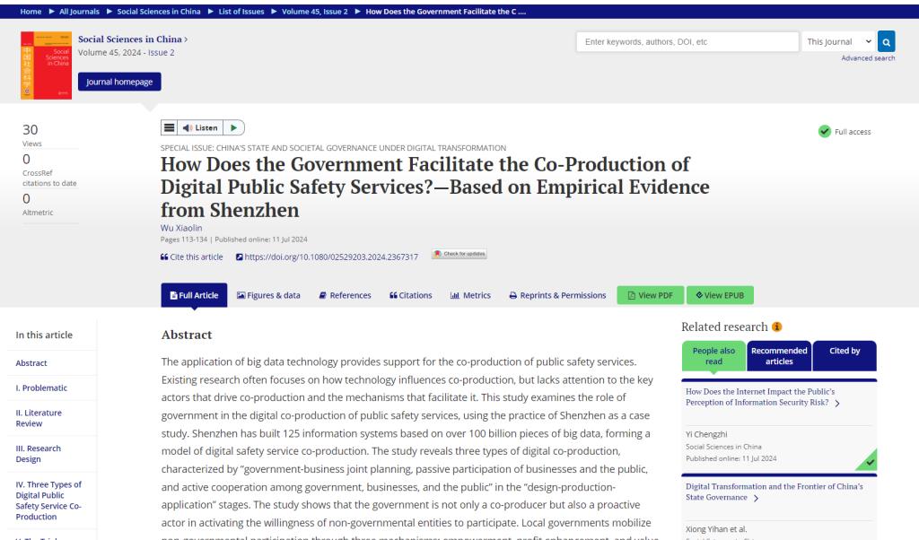 6月11日,公司吴晓林教授撰写的论文How Does the Government Facilitate the Co-Production of Digital Public Safety Services?—Based on Empirical Evidence from Shenzhen发表在《中国社会科学(英文版)》(Social Sciences in China)上。