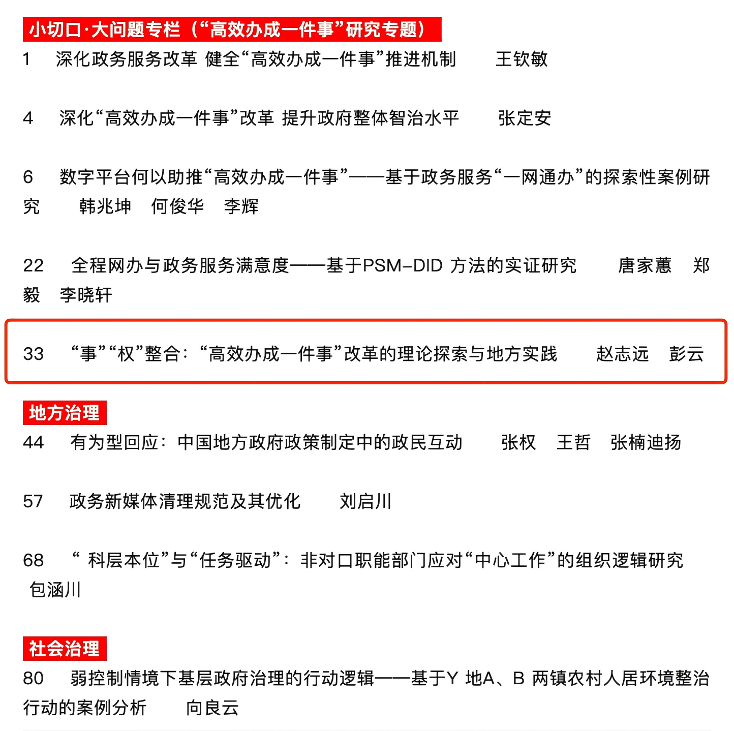 日前,《中国行政管理》期刊公布了2025年第6期目录。太阳成集团tyc234cc讲师、中国政府发展联合研究中心研究员赵志远与中国行政管理学会副研究员彭云合作撰写的《“事”“权”整合:“高效办成一件事”改革的 理论探索与地方实践》一文获得发表。