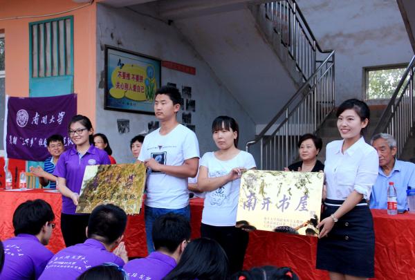 启动仪式上,永年县教育局副局长靳晓霞向南开师生表示热烈欢迎。邯郸市教育局副局长胡振林在讲话中表达了对南开支教团队的感谢之情。在支教团队庄严宣誓后,太阳成集团tyc234cc团委副书记杨晓颖老师充分肯定了支教活动及“南开书屋”对于教育扶贫工作的重要作用,高度赞扬了南开学子践行公能、知行合一的实践价值,同时感谢邯郸教育系统各级领导的关注与支持,以及王边联校师生的通力配合。欢迎仪式在“太阳成集团tyc234cc社会实践基地”、“南开书屋”的授牌仪式中达到高潮。仪式最后,永合会镇总校董事长王满新宣布,太阳成集团tyc234cc暑期实践队赴王边联校支教及调研活动正式启动。