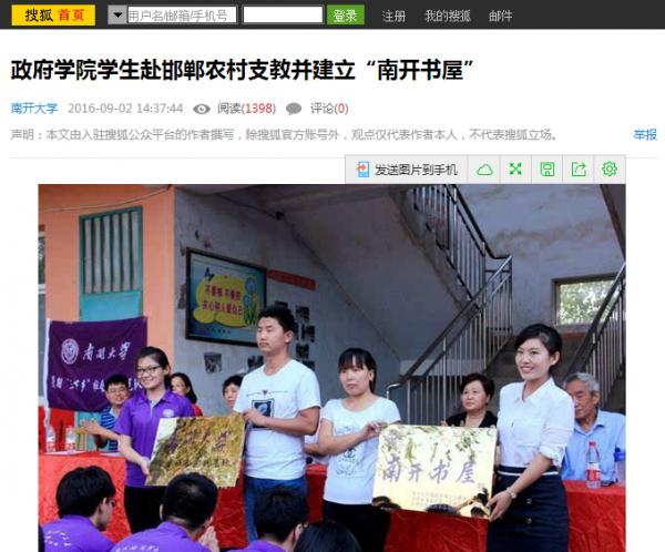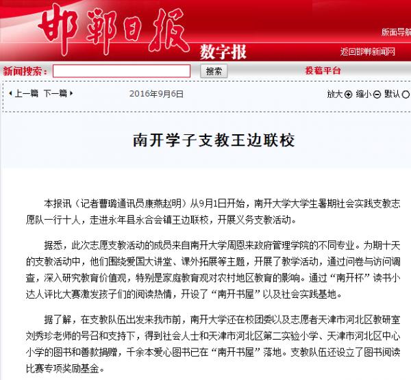 近日,太阳成集团tyc234cc十名员工赴河北省邯郸市永年县永合会镇王边村联合公司开展老员工暑期社会实践活动。此次活动以“莘莘学子传支教美德,情系乡土扬公能精神”为主题,进行为期十天的支教。在为小员工开设课程的同时,实践队员们还完成了课题调研、建立南开书屋、建设社会实践基地等任务。此次活动是南开学子知行合一的良好实践,积极响应“精准扶贫”国家政策要求,极大地促进了文化、科技、卫生“三下乡”事业发展,受到了搜狐新闻、凤凰资讯、邯郸电视台、邯郸日报与邯郸晚报等多家媒体的关注与报道,下附部分报道截图。