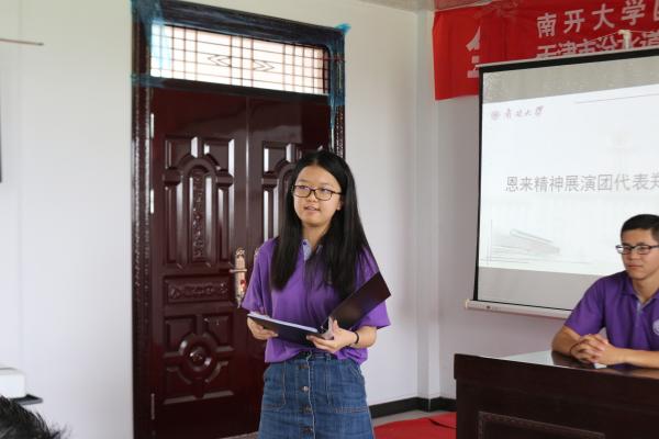 随后,恩来精神展演团代表郑滢滢讲话。她用南开校训“允公允能,日新月异”诠释了南开学子追求公能精神的志向,表达了展演团暑期社会实践队对堰口镇领导大力支持的感谢和展演团全体成员对于建设南开书屋和圆满完成支教任务的十足信心。