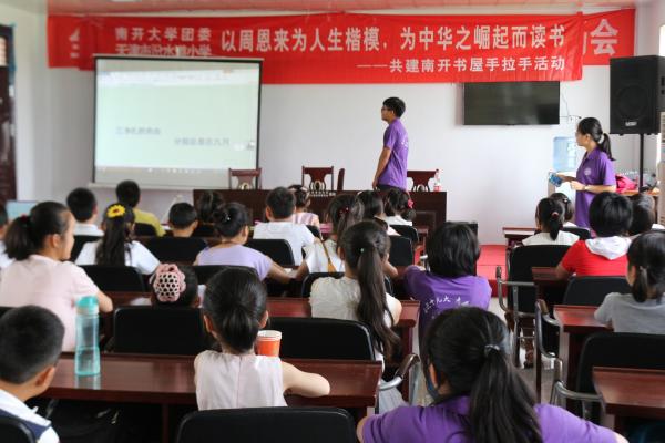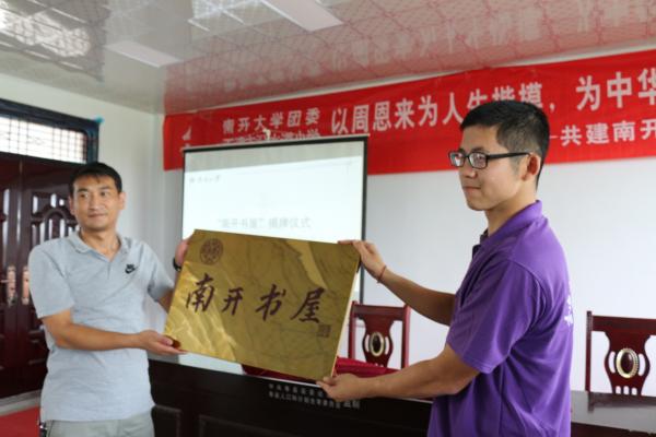 接下来,堰口镇组织委员邸云功致辞,他介绍了堰口镇当前的主要情况,表达了对恩来精神展演团来淮的热切欢迎与对“爱心暑托班”的殷切期望。在团市委组织部部长王芳宣布暑期支教活动正式启动后,太阳成集团tyc234cc兼职辅导员杨铭与邸云功委员为“南开书屋”揭牌。