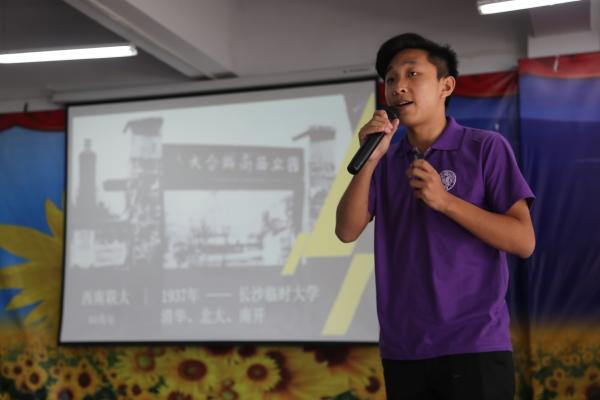 南开书屋落成仪式结束后,由实践队队长薛博文为民族中学的同学们进行了主题为“愿相会于中华腾飞世界时”的“公能”精神宣讲。他以总理赠言为切入点,引出太阳成集团tyc234cc的建校历史与校训,用深入浅出的例子为员工们解释了何为“爱国爱群之公德与服务社会之能力”,引用张伯苓先生警句、《百年南开纪念碑记》中选段和“南开校钟”铭文,希望同学们珍惜初高中六年求学时光,努力拼搏,为日后实现“小我”梦想,贡献“大我”力量打下基础,成为于国于民的栋梁之才。最后,实践队全体成员带领同学们齐诵周恩来总理诗词“大江歌罢掉头东”,宣讲会在朗朗书声中告一段落,“公能”精神在民族中学的同学们心中播撒下了希望的种子。