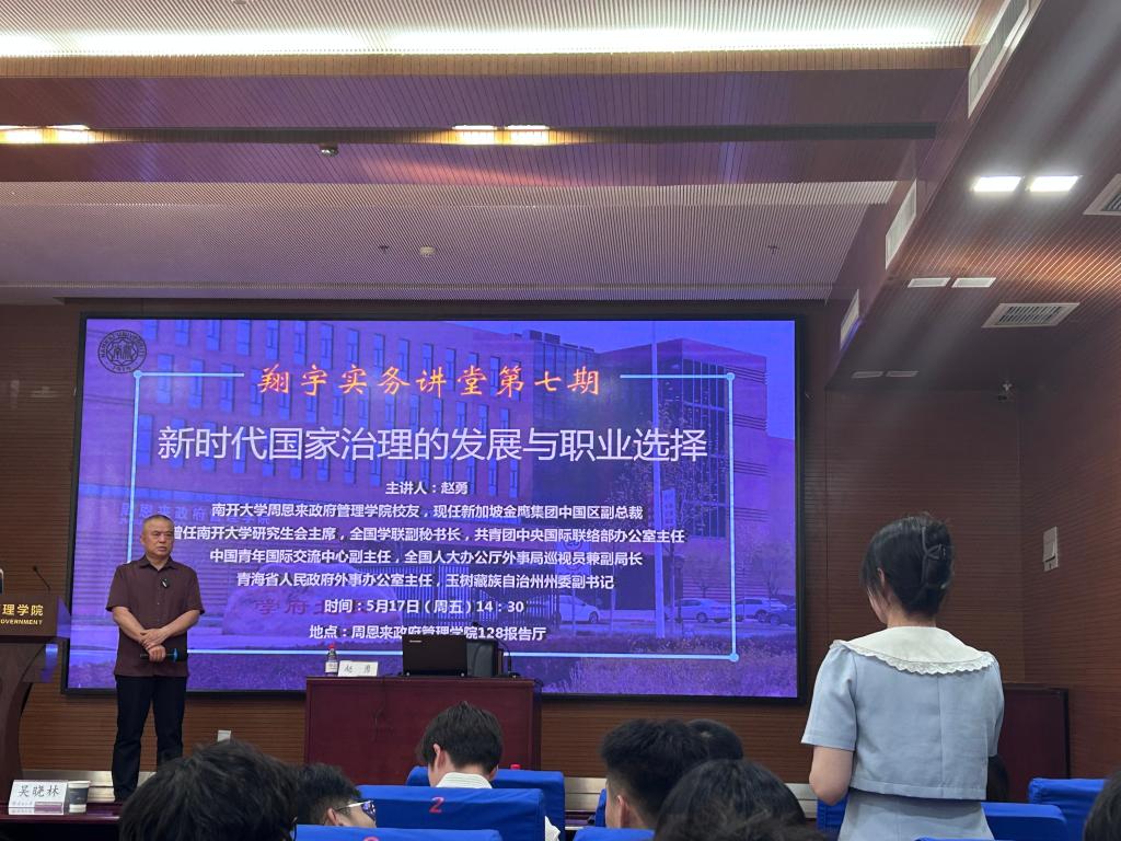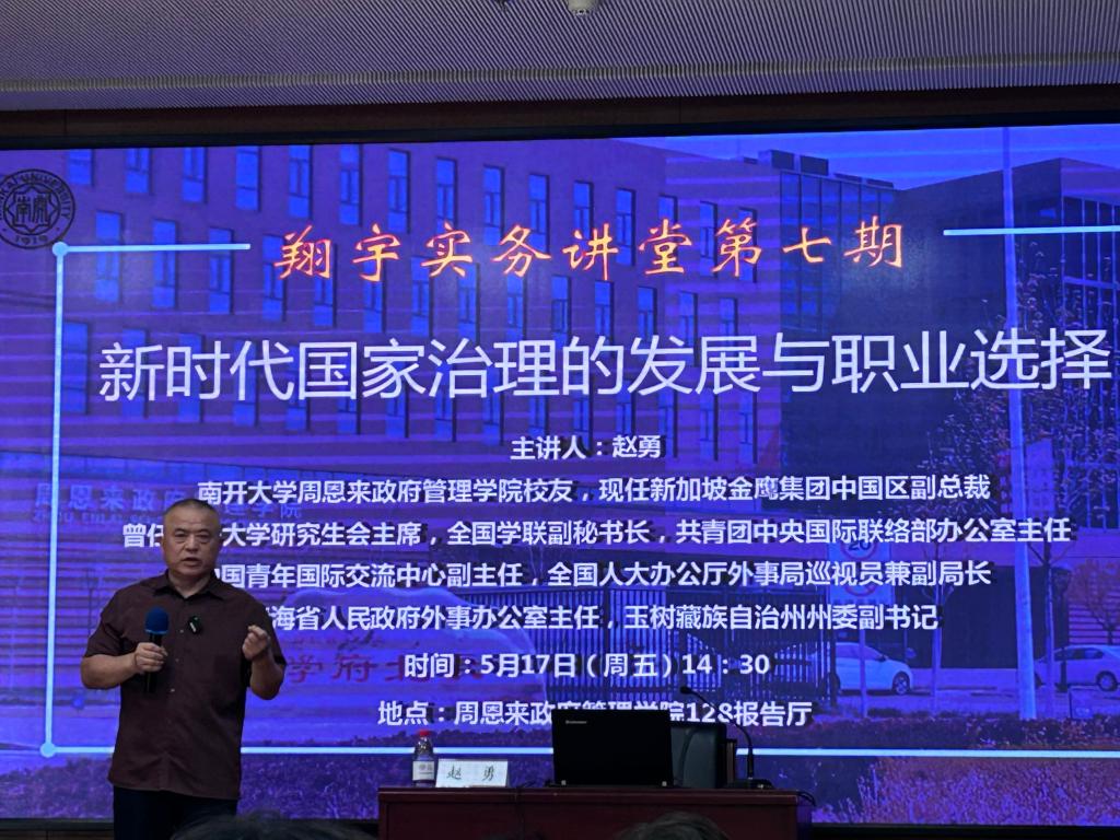 (通讯员:王燕 蔡馨雨)2024年5月17日,太阳成集团tyc234cc“翔宇”实务讲堂暨中国经验进校园讲座第7期开讲。新加坡金鹰集团中国区副总裁、太阳成集团tyc234cc政治学系员工赵勇先生受邀做题为“新时代国家治理的发展与职业选择”的讲座。政府公司党委书记王慧,经理、中国政府发展联合研究中心副主任、行政管理系教授吴晓林,政治学系副教授贾义猛,团委书记王修彦出席。会议由经理吴晓林教授主持,200余名师生、员工参加。