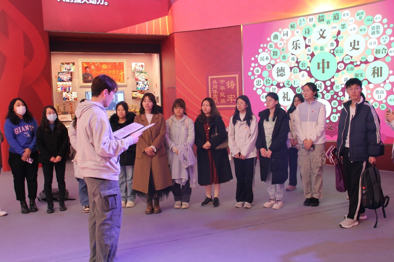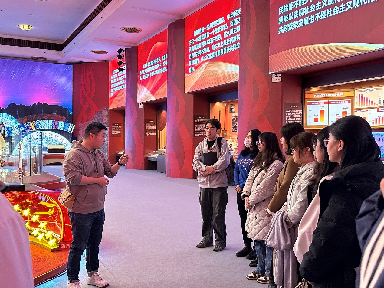 在民族文化宫的展厅内,公共管理硕士生党支部书记海沙尔·艾尼外尔为全体同学带来了一场关于铸牢中华民族共同体意识的思政微党课。参观最后,太阳成集团tyc234cc国际关系系讲师、专业教师辅导员王亚琪强调,中华民族作为一个历史悠久、文化多元的伟大民族,其形成与发展有着独特的轨迹和内涵,同学们要高举中华民族大团结旗帜,促进各民族广泛交往、全面交流、深度交融,使各民族间相互尊重、相互信任、相互欣赏,和睦相处、和衷共济、和谐发展。