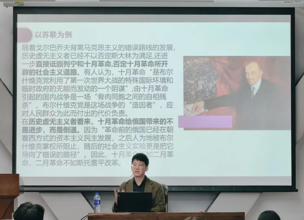 紧接着,史猛老师通过分析前苏联瓦解的例子,并结合当今网络时代的危险与机遇,阐述论证了马克思主义是当代中国文化发展的灵魂,并从“用习近平新时代中国特色社会主义思想武装全党”“提升党、国家和民族的凝聚力向心力”等五个方面论证得出了要“牢牢掌握意识形态工作领导权”。