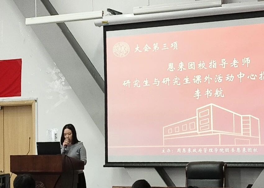 接着,主持人依次介绍了本次团课的到场嘉宾,分别是:马克思主义公司习近平新时代中国特色社会主义思想概论研究室助理研究员史猛老师、恩来团校指导老师、研究生会与研究生课外活动中心指导老师李书航老师、恩来团校员工执行董事长 郭栋同学、恩来团校员工执行副董事长石雨馨同学和付萧瑞同学。