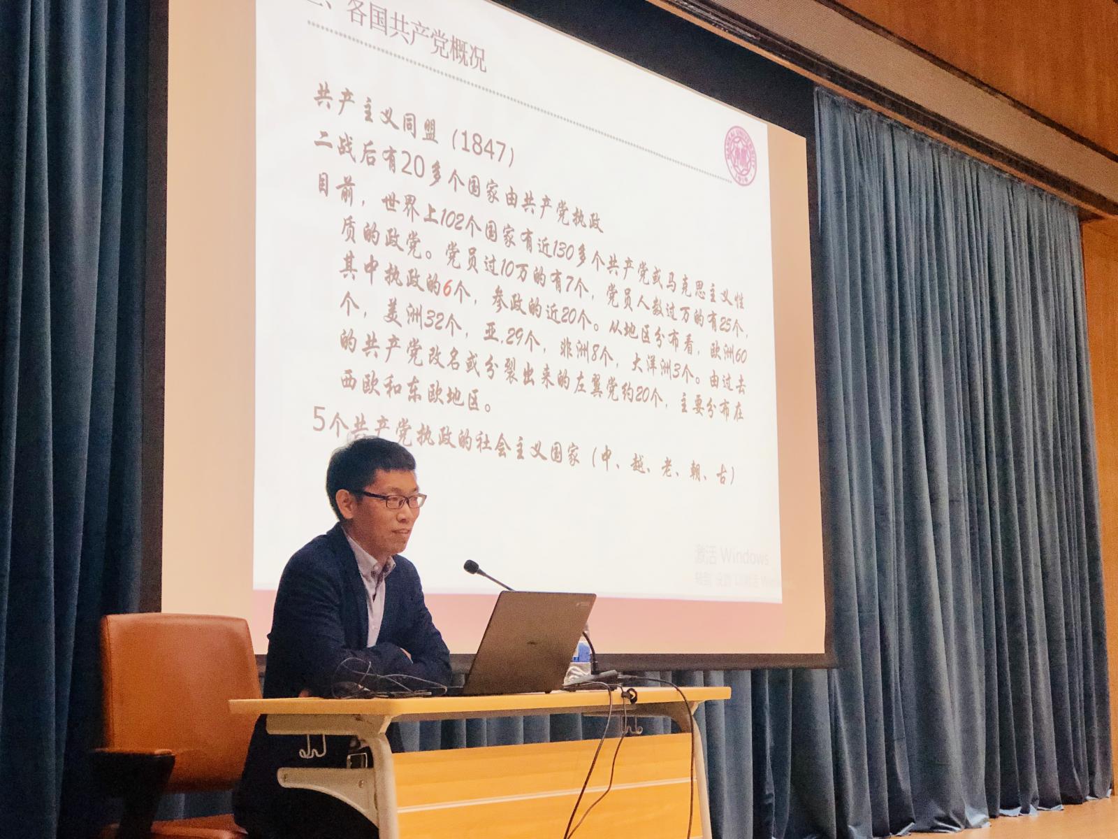 此次党课,郭道久教授在“中国大力推动人类命运共同体建设”的背景下,为学员们综合介绍了当今世界各国共产党的概况,以东西方不同区域为划分,以各国早期共产党发展沿革为线索,分析了在不同政治经济体制下各国共产党的发展规模、组织系统、政治处境和前进道路。