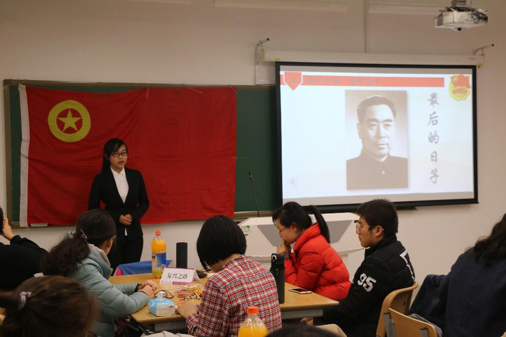 本次活动依托十九大胜利召开为背景,结合专业自身特色,以铭记历史与学习十九大报告为重点,进行学习、交流。活动由李硕、赵乾主持,在团支部成员高昂的团歌声中开始。