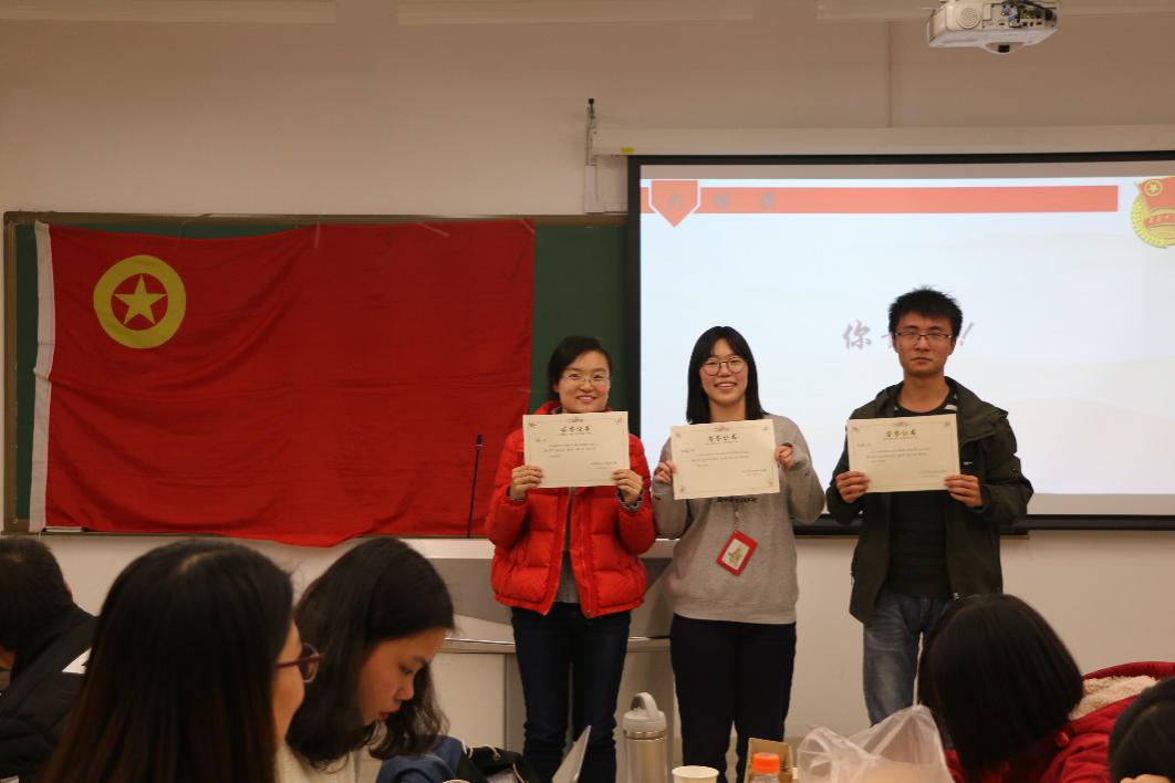 该部分为知识竞答环节,题目分为小组必答题和个人抢答题。五个团小组积极参与,踊跃发言,经过激烈的角逐,“吉吉王国”团小组及郜淼、刘雨喆、邱文辉三位同学胜出,分别被授予16级国政专业团支部“理论之组”和“理论之星”荣誉称号。在欢声笑语之中,同学们巩固了理论学习的内容,对十九大报告有了更深入的了解。