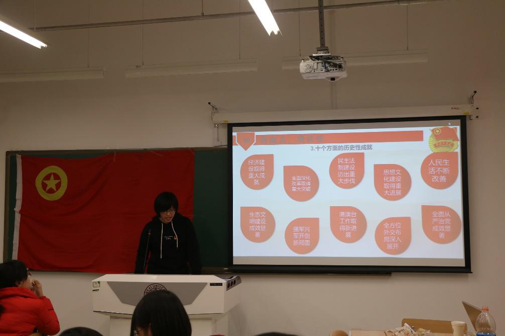 团支书李硕围绕“不忘初心,牢记使命,高举中国特色社会主义伟大旗帜,决胜全面建成小康社会,夺取新时代中国特色社会主义伟大胜利,为实现中华民族伟大复兴的中国梦不懈奋斗”的主题,对十九大报告的内容做了简要的介绍,分别就报告的十三个板块做了梳理,同时结合国政专业特色,着重介绍了十九大报告中“坚持和平发展道路,推动构建人类命运共同体”这一部分内容。