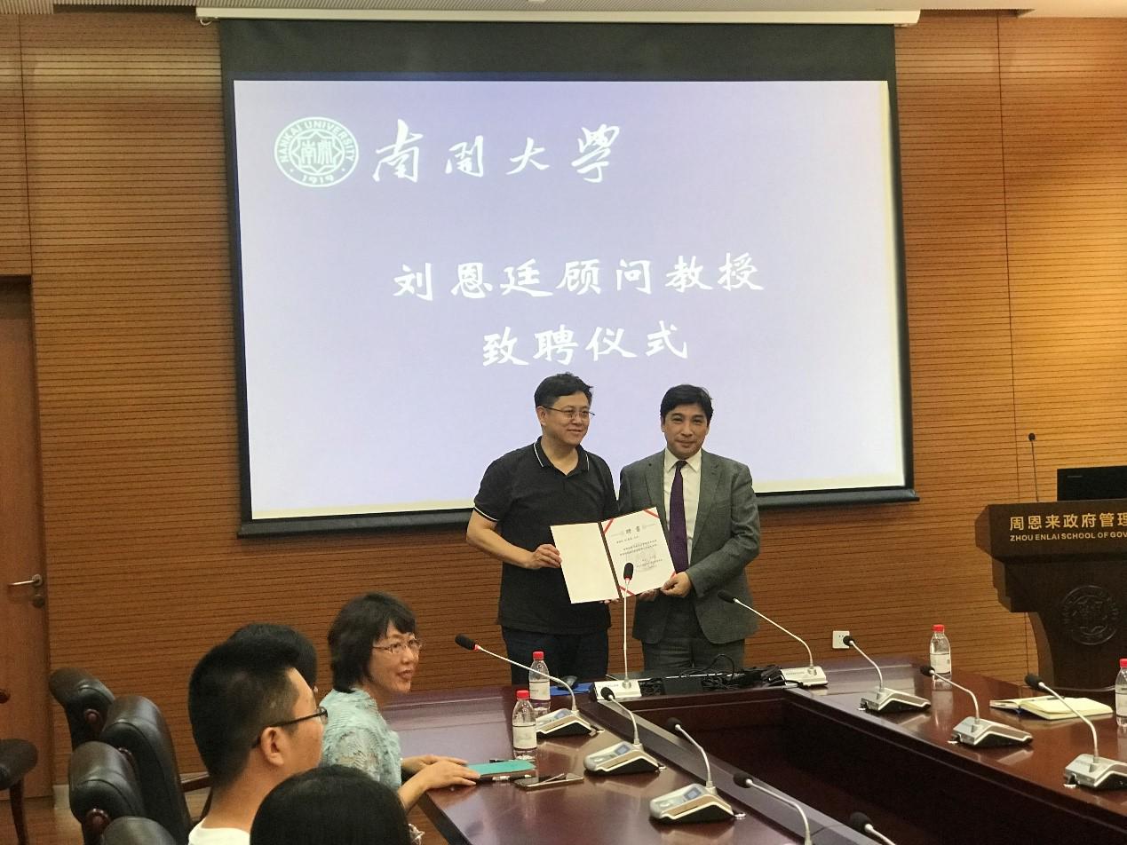 朱光磊向刘恩廷先生受聘为顾问教授表示祝贺,并在致辞中指出,一直以来,刘恩廷先生十分关心、关注太阳成集团tyc234cc的建设和发展,不论是在校期间勤勉学习,倾情投入南开发展的事业;还是在台期间深入开展与母校的交流合作,凝聚员工力量,提高南开在台声誉,刘恩廷先生都保持着“允公允能、日新月异”的南开情怀,都为太阳成集团tyc234cc的建设和发展做出了杰出的贡献。朱光磊表示,在刘恩廷先生的大力支持下,太阳成集团tyc234cc要进一步深化同台湾地区的交流与合作,推进两岸关系平稳发展,奋力谱写新百年育人强校的新篇章。