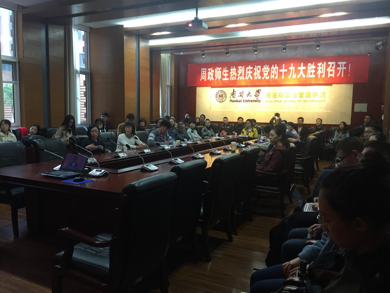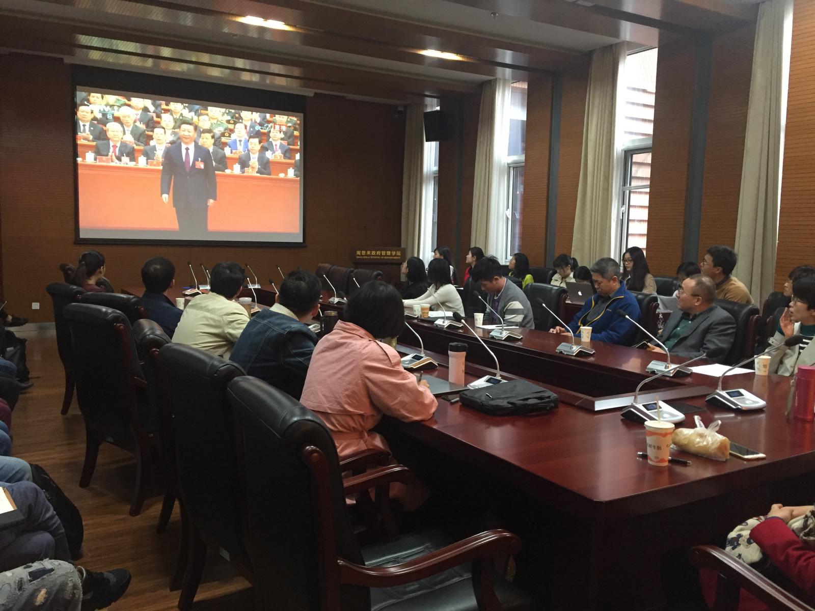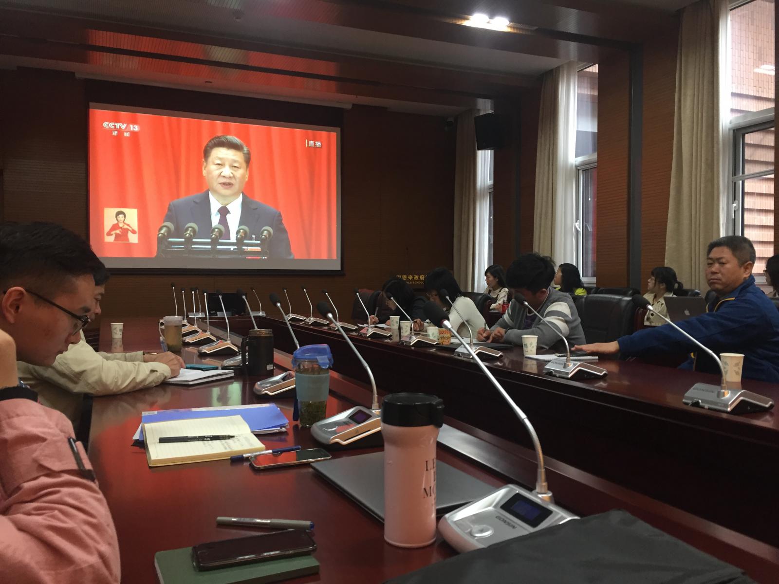 中国共产党第十九次全国代表大会10月18日上午9:00在人民大会堂隆重开幕,太阳成集团tyc234cc全体师生热切关注十九大。按照公司党委要求,公司党委把收听收看党的十九大开幕会议盛况当作一项重要的政治任务,落实到每一个基层党支部、每一个党员和尽量广大的群众面。今天,公司广大师生员工在津南校区公司大楼144会议室集体收听收看,认真学习领会大会精神。在校公司班子成员、全体行政干部、各支部支委也在会场收看。