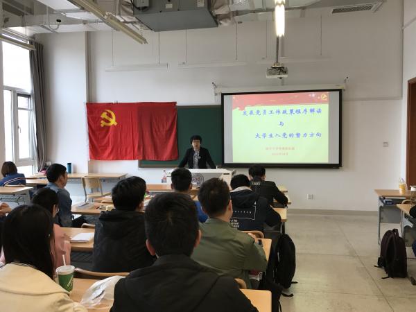 李敏丽老师以“发展党员工作政策程序解读与老员工入党的努力方向”为主题,通过对《中国共产党发展党员工作细则》的讲解,详细介绍了发展党员工作程序及规范,要求同学们以“理想远大、品学兼优、全面发展”为努力方向,认真贯彻学党章党规、学系列讲话、做合格党员的“两学一做”要求,严格要求自己,争取早日成为一名合格党员。