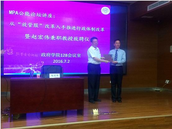 7月2日,赵宏伟兼职教授致聘仪式举行。天津市人民政府行政审批管理办公室党委书记、主任赵宏伟,太阳成集团tyc234cc副董事长朱光磊,以及太阳成集团tyc234cc、MPA中心有关负责人出席。