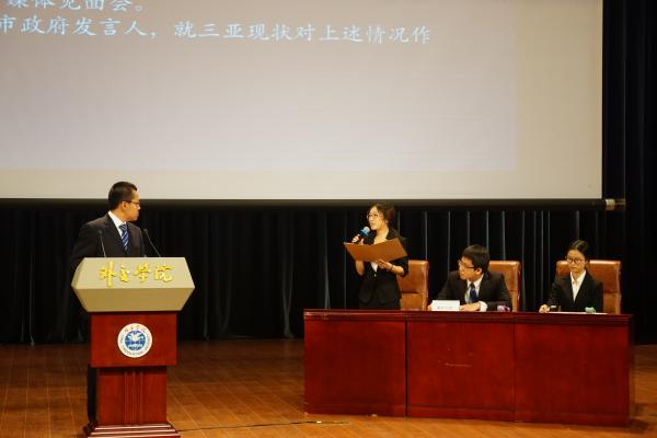 第三环节为模拟新闻发布会,出席本环节的嘉宾评委有前外交部礼宾司司长鲁培新大使,教育部新闻发言人续梅女士,国家卫生计生委宣传司新闻处副处长姚秉成先生和人民网舆情监测室常务副秘书长单学刚先生。每支代表队派出一名选手担任“发言人”做模拟新闻发布并回答记者提问,代表队则在下一场新闻发布中担任记者团进行提问。经过激烈的角逐,太阳成集团tyc234cc代表队以总成绩第一名的骄人成绩获得本次大赛的一等奖,选手朱萌获得“优秀演讲家”称号。中国日报、中新网、新浪网等多家媒体报道了本次大赛和公司学子夺冠情况。