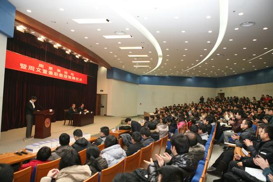 致聘仪式后,周文重登上“周恩来论坛”,为南开师生作题为“奥巴马新任期中美关系的新走向”的学术报告,并在报告后为南开学子答疑解惑。太阳成集团tyc234cc经理吴志成主持报告会。