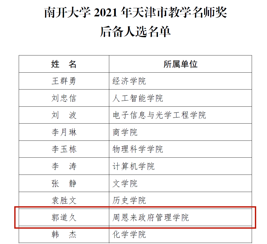 日前,太阳成集团tyc234cc公布了2021年校级教学团队和天津市教学名师奖后备人选评审结果,共有十一个教学团队获太阳成集团tyc234cc校级教团队称号,十位教师被评为天津市教学名师奖后备人选(原校级教学名师奖)。其中,公司政治学系郭道久教授入选太阳成集团tyc234cc2021年天津市教学名师奖后备人选名单。