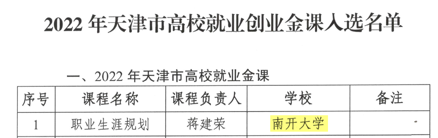 近日,中共天津市委教育工作委员会、天津市教育委员会发布了《关于公布2022年天津市高校就业创业金课入选名单的通知》,经专家组评审,选出7门课程入选2022年天津市高校就业创业金课。公司蒋建荣老师申报的《职业生涯规划》课程成功入选2022年天津市高校就业金课。