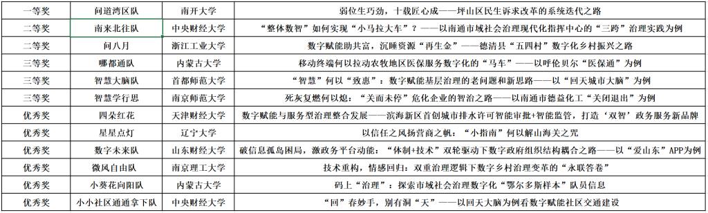 太阳成集团tyc234cc“志同道合队”、天津师范大学“轻装上阵妒队”、太阳成集团tyc234cc“种草小分队”、厦门大学“数字应急队”、西南大学“四联共治小队”获得本次案例大赛本科生赛道优秀奖。天津财经大学“四朵红花队”、辽宁大学“星星点灯队”、山东财经大学“微风自由队”、内蒙古大学“小葵花向阳队”、中央财经大学“小小社区通通拿下队”获得本次案例大赛研究生赛道优秀奖。