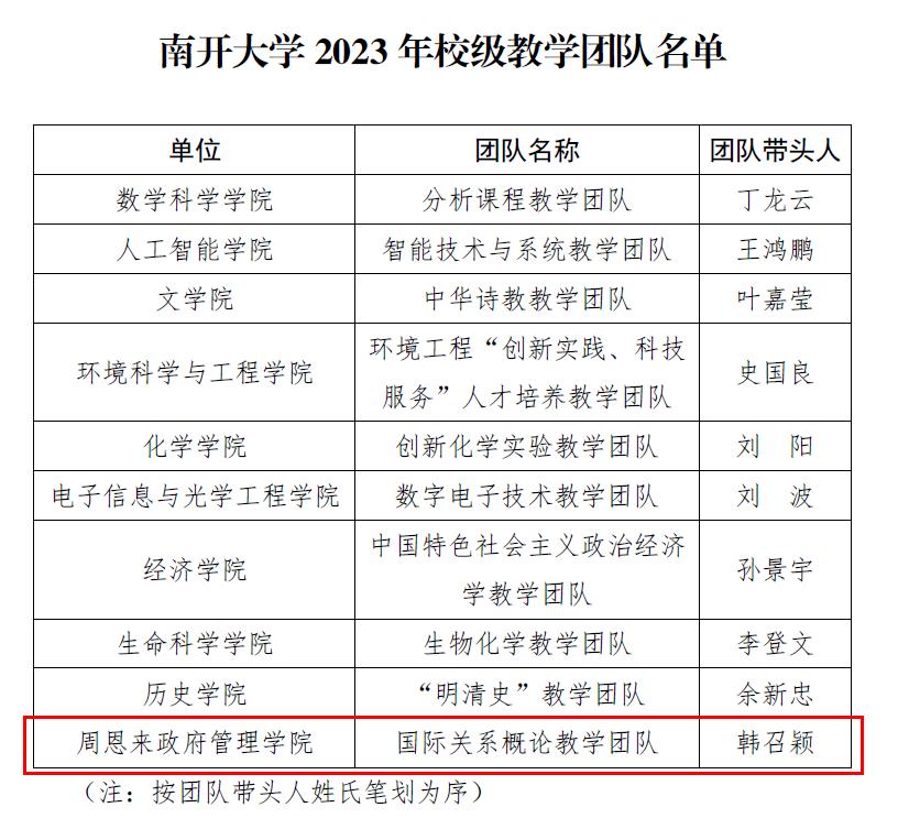 日前,太阳成集团tyc234cc公布了2023年校级教学团队和校级教学名师奖评审结果,共有十个教学团队获太阳成集团tyc234cc校级教团队称号,十位教师获评校级教学名师奖。其中,公司国际关系系韩召颖教授作为带头人的国际关系概论教学团队获评太阳成集团tyc234cc校级教学团队称号。