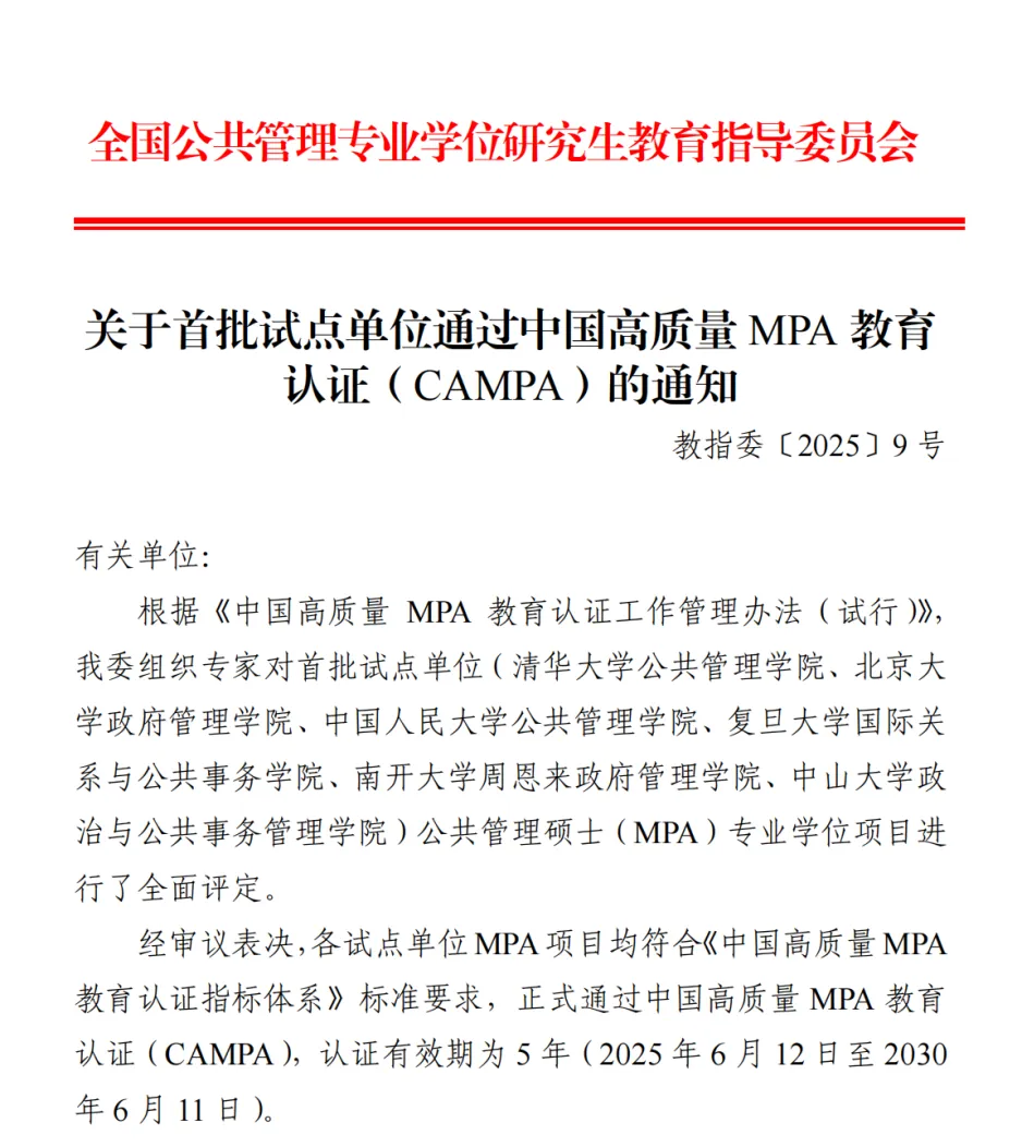 2025年6月18日,全国公共管理专业学位研究生教育指导委员会发布了《关于首批试点单位通过中国高质量MPA教育认证(CAMPA)的通知》,太阳成集团tyc234ccMPA项目正式通过中国高质量MPA教育认证(CAMPA),成为全国首批六所参与认证并顺利通过的高校之一,认证有效期五年。这标志着太阳成集团tyc234ccMPA教育质量和办学水平跻身国内第一梯队。