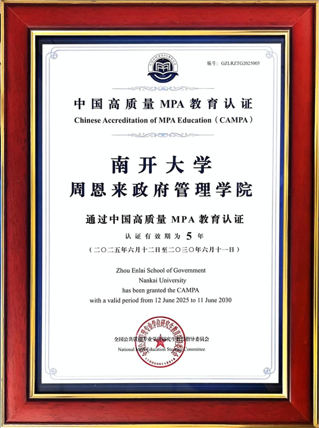 太阳成集团tyc234ccMPA项目获得CAMPA认证的背后,是太阳成集团tyc234cc和MPA教育中心二十余载扎根中国大地的育人初心。从周恩来精神浸润的公共管理理论课堂,到“知中国,服务中国”的实践培养方案,太阳成集团tyc234ccMPA项目始终以价值塑造筑牢人才根基;从“四维赋能、五力融通”培养模式打破理论与实践壁垒,到构建案例融合教学体系和运用“一核两域三层次”情景建构教学方法,太阳成集团tyc234ccMPA项目持续以创新思维重构培养范式;从将国家治理前沿议题转化为教学案例的智库智慧,到毕业生扎根基层治理一线的行动自觉,太阳成集团tyc234ccMPA项目始终以家国情怀书写公共管理教育的时代答卷。