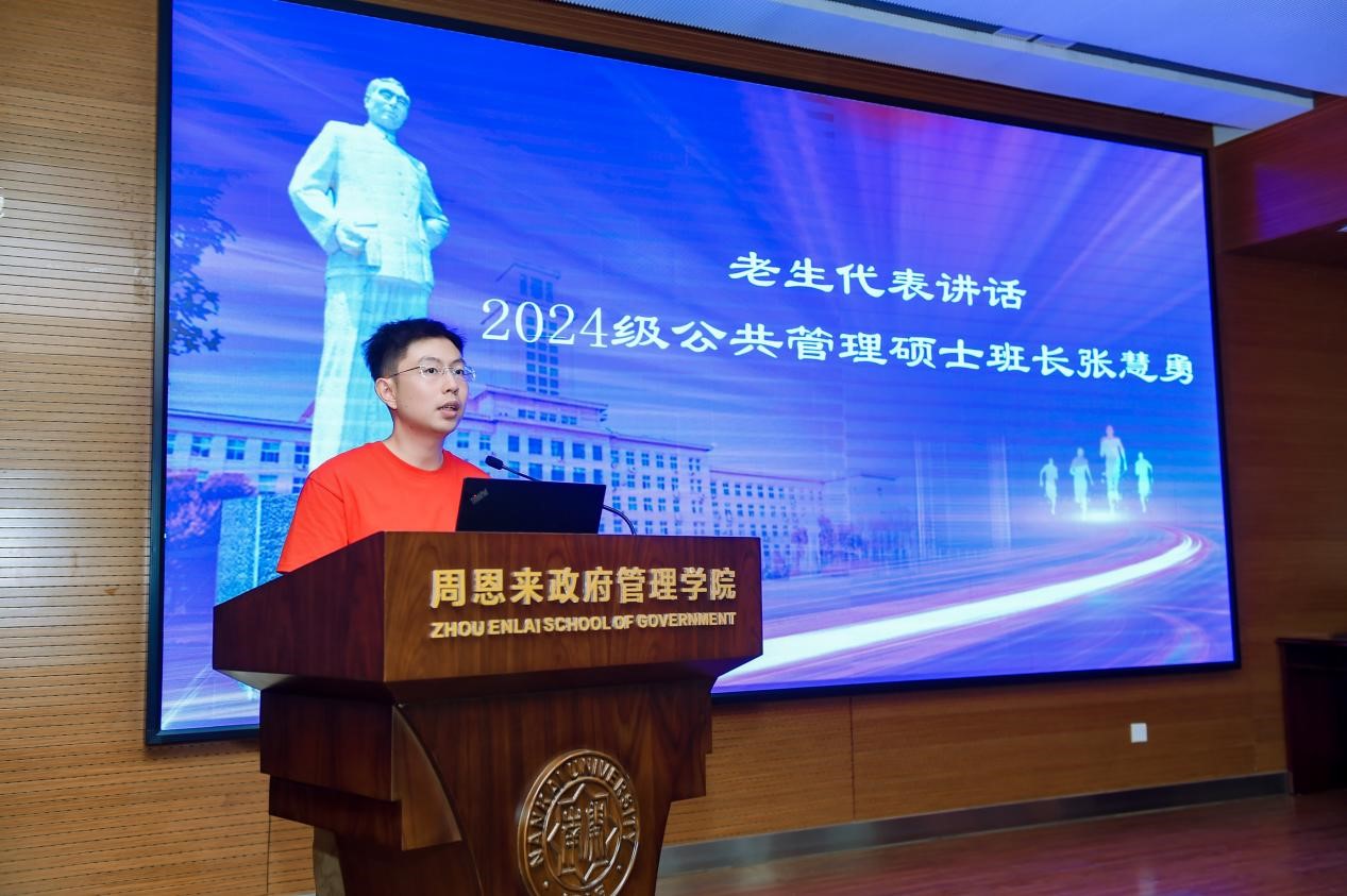 2024级公共管理硕士班长张慧勇作为老生代表分享了心得,他表示,南开MPA的学习不仅是知识的积累,更是思维方式的重塑。希望新同学们珍惜每一次课堂讨论与实践机会,在交流中碰撞思想,在实践中明晰方向。
