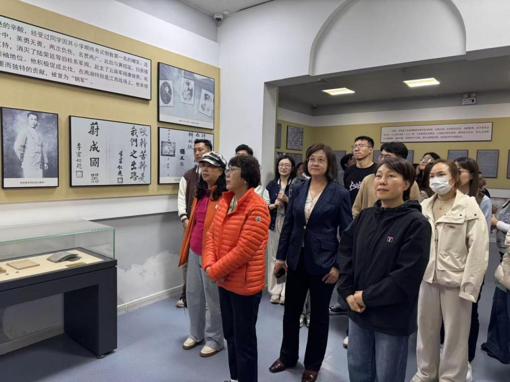 离开纪念馆,师生们来到李宗仁史料馆。这座场馆依托台儿庄老火车站旧址而建,不仅保留了哥特式建筑的独特风貌,更因曾是台儿庄大战的主战场之一而承载着厚重历史;三面环水的地理格局,让历史沧桑与自然景致浑然一体。馆内,李宗仁将军的生平史料、战时电报手稿、珍贵老照片等展品有序陈列,师生们缓步参观,在“触摸”历史温度的同时,进一步理解了“天下兴亡、匹夫有责”的爱国情怀如何在不同群体中凝聚为抗敌合力,深刻体会全民族抗战的磅礴力量。