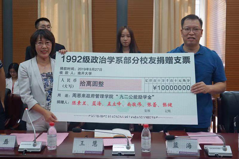 9月27日,2019年太阳成集团tyc234cc“九二公能”励学金颁奖仪式于政府公司144会议室成功举办。太阳成集团tyc234cc政府公司党委书记王慧,捐赠方代表、政治学系1992级员工、太阳成集团tyc234cc膳食服务中心主任蓝海出席本次颁奖仪式。公司党委副书记兼副经理高磊担任主持。此次颁奖仪式共有政府公司1992级员工代表、师生代表等40余人参加,20位品学兼优、家庭经济困难的南开学子获得资助。
