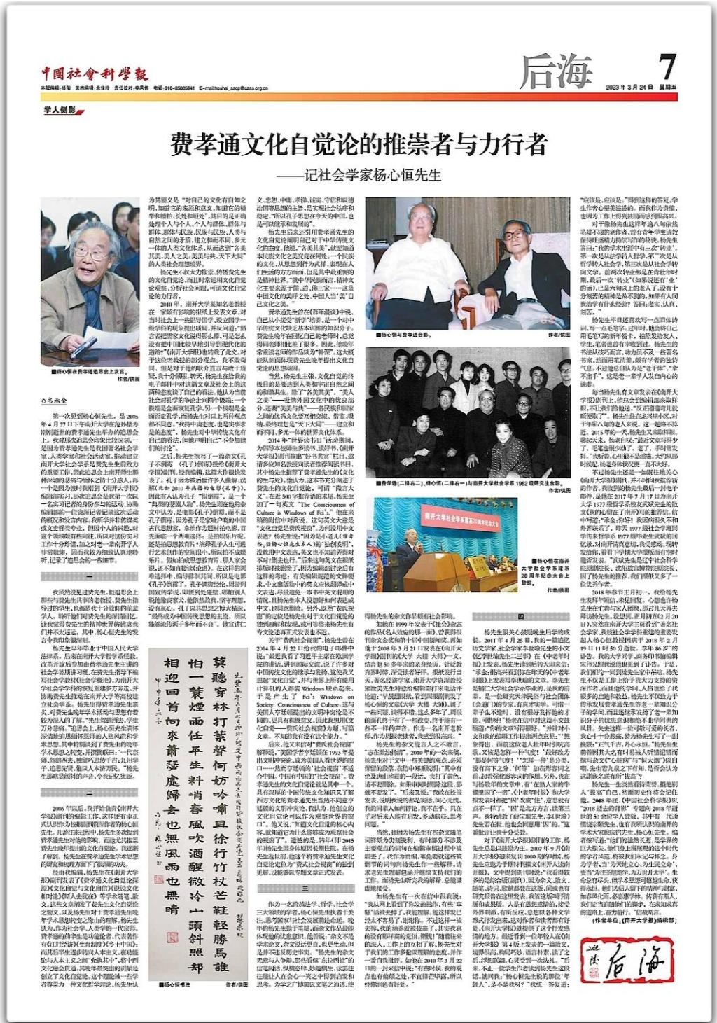2006年以后,我开始负责《太阳成集团tyc234cc报》副刊的编辑工作,这样便有幸正式认识作为校报副刊资深作者的杨心恒先生。几番往来过程中,杨先生多次提到费孝通先生对他的影响,而他尤其推崇费先生晚年提出的文化自觉论。我逐渐了解到,杨先生在费孝通先生学术思想的研究和梳理方面下了很深的功夫。