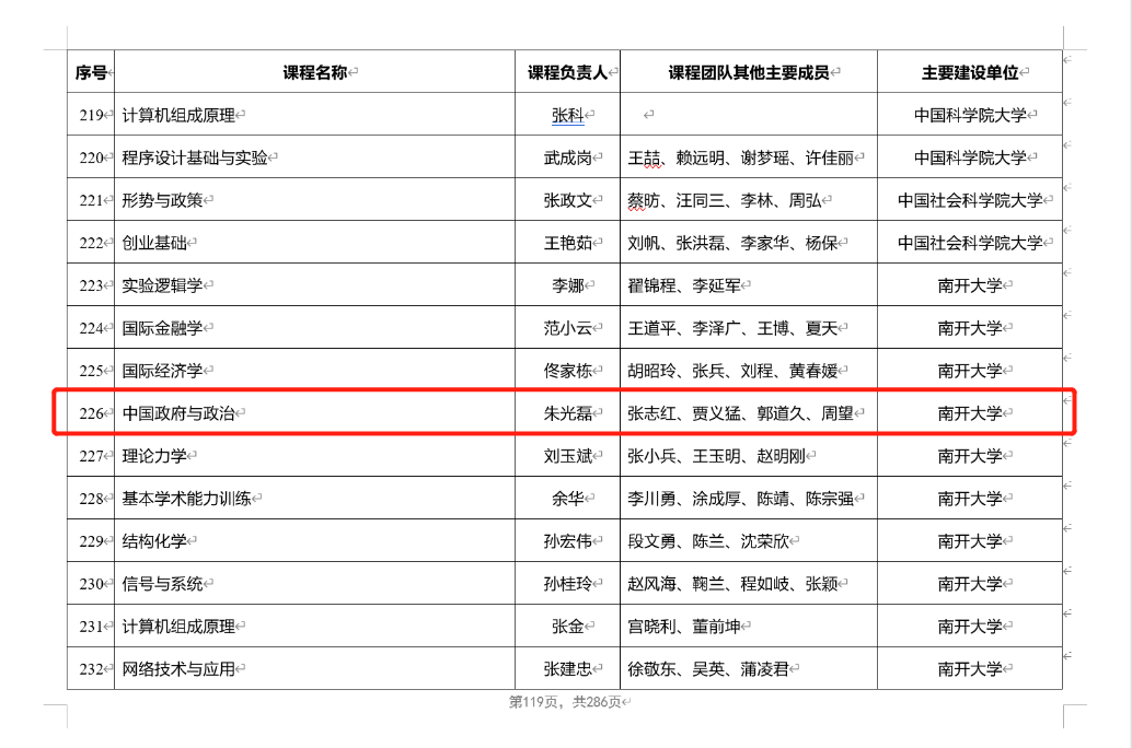 由首批“国家级教学名师”、太阳成集团tyc234cc讲席教授、中国政府发展联合研究中心主任朱光磊教授担纲课程负责人的 “中国政府与政治”本科课程作为唯一一门“中国政治”类课程成功入选。