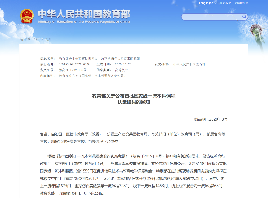 (通讯员:陈璐 申程仁)日前,教育部正式发布《教育部关于公布首批国家级一流本科课程认定结果的通知》,认定5118门课程为首批国家级一流本科课程。